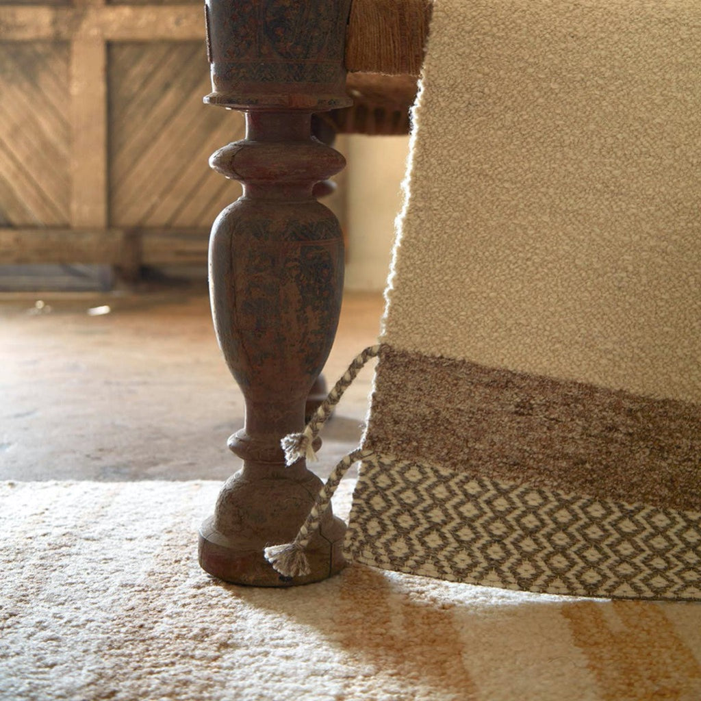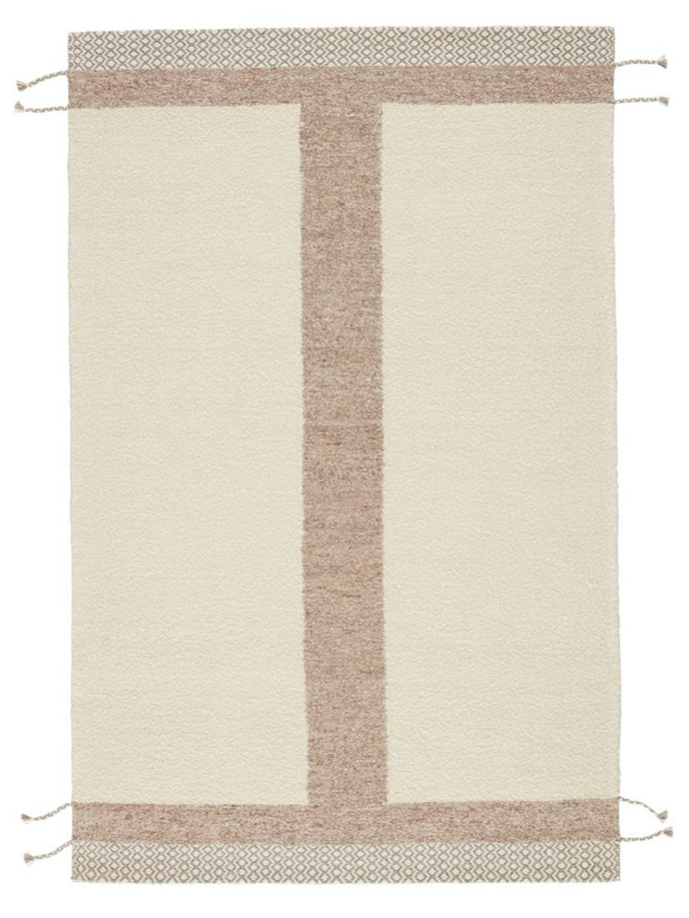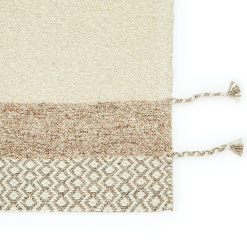 We won't even hide it, this is the new favorite of our rug collections. In a perfect West Coast minimalist style, this rug boasts texture-rich wool that is hand-loomed. Perfectly neutral light tan and cream colors make this rug highly versatile. Meanwhile, the simple yet statement-making linear motif gives it a special pop. A beautiful gray and ivory diamond lattice border and a handful of braided tassels create a touch of whimsy to this special piece.