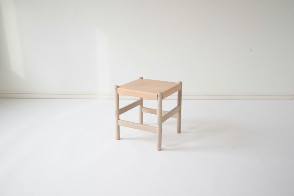 This modern take on a traditional shaker-style stool is a perfect accent item to place under an entryway console or in a corner with some stacked books. Its nude leather is sourced from a family-owned tannery in Tuscany and is meant to develop a beautiful patina with age. Its solid white oak wood is rubbed with luxurious tenna oil, which was developed by its designer. The stool has intricate tenons exposed and is handcrafted using traditional joinery techniques.