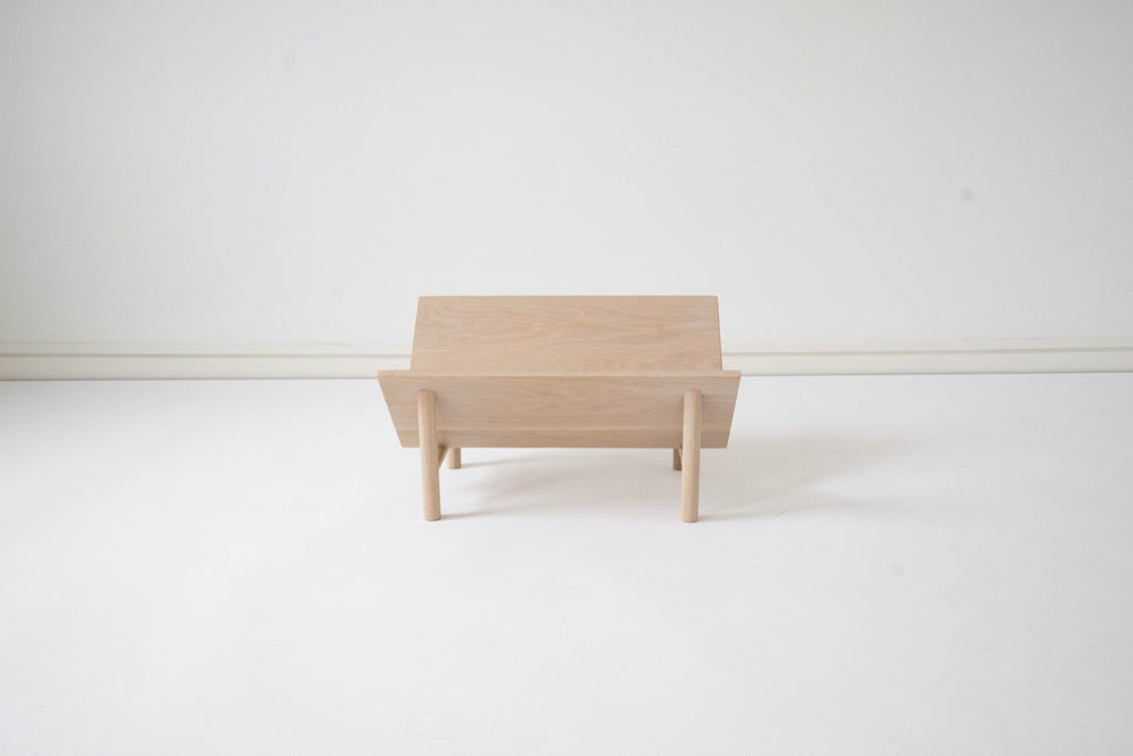 Place the floating bookstand by your couch for holding your favorite magazines, records, or books. This solid white oak piece is artfully rubbed by hand with a house-made tenna oil for a perfect finish. No nails or screws are used in handcrafting this bookstand as traditional joinery is used to build it.